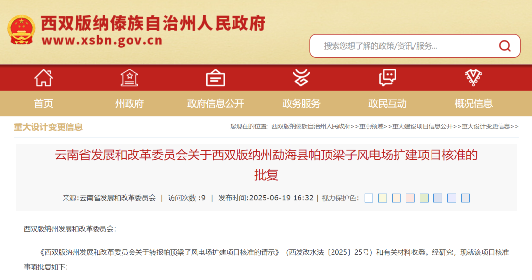6月19日,云南省发展和改革委员会发布关于西双版纳州勐海县帕顶梁子风电场扩建项目核准的批复。