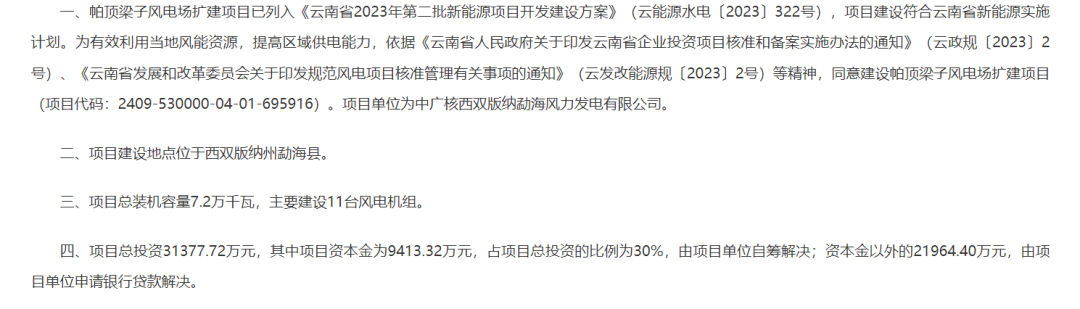 公告显示,帕顶梁子风电场扩建项目已列入《云南省2023年第二批新能源项目开发建设方案》,项目建设符合云南省新能源实施计划。同意建设帕顶梁子风电场扩建项目,项目单位为中广核西双版纳勐海风力发电有限公司。