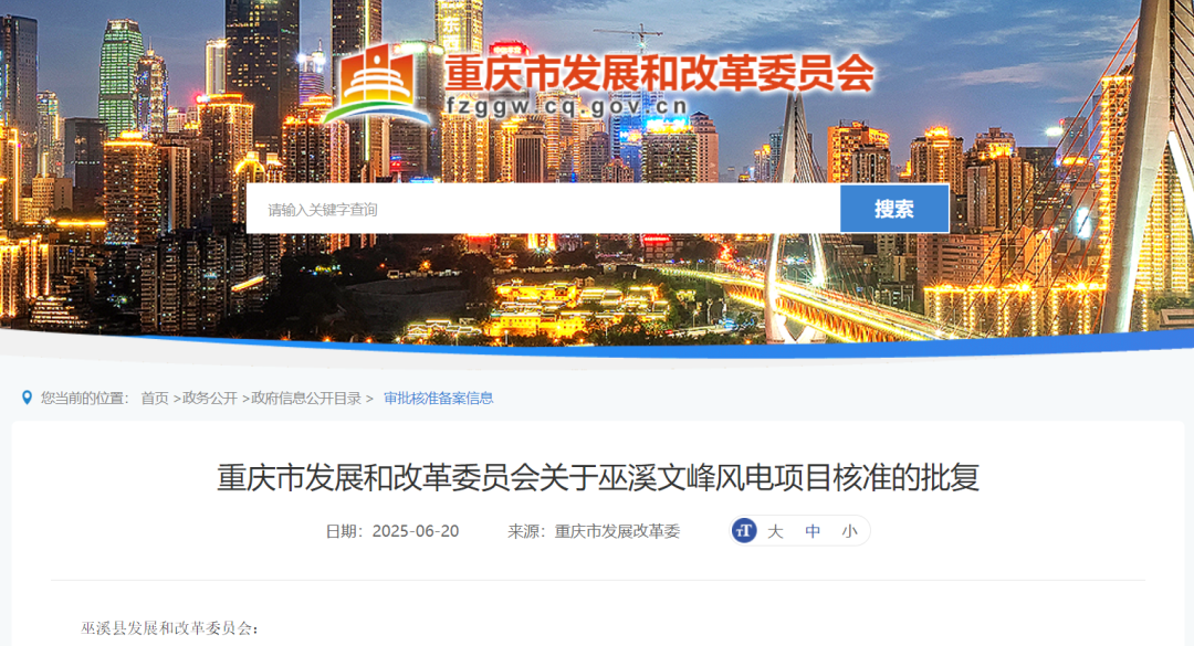 6月20日,重庆市发展和改革委员发布于巫溪文峰风电项目核准的批复。